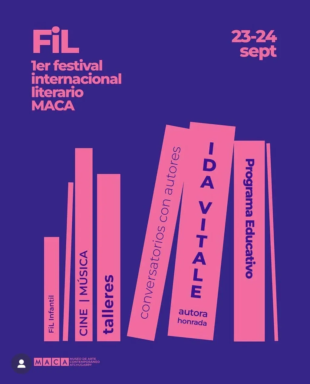 Letras en el MACA. El 23 y 24 de setiembre se realizará el 1er festival internacional literario en el MACA, con participación de autores, entrevistas y debates en el este, en un entorno privilegiado. Las actividades son gratuitas con cupos limitados (reservar acá). Entre los participantes estará Selva Almada, Dolores Reyes y Pedro Mairal, todos de Argentina, David James Poissant, de Estados Unidos, entre otro países, incluyendo autores uruguayos como Daniel Mella y Valentín Trujillo.
