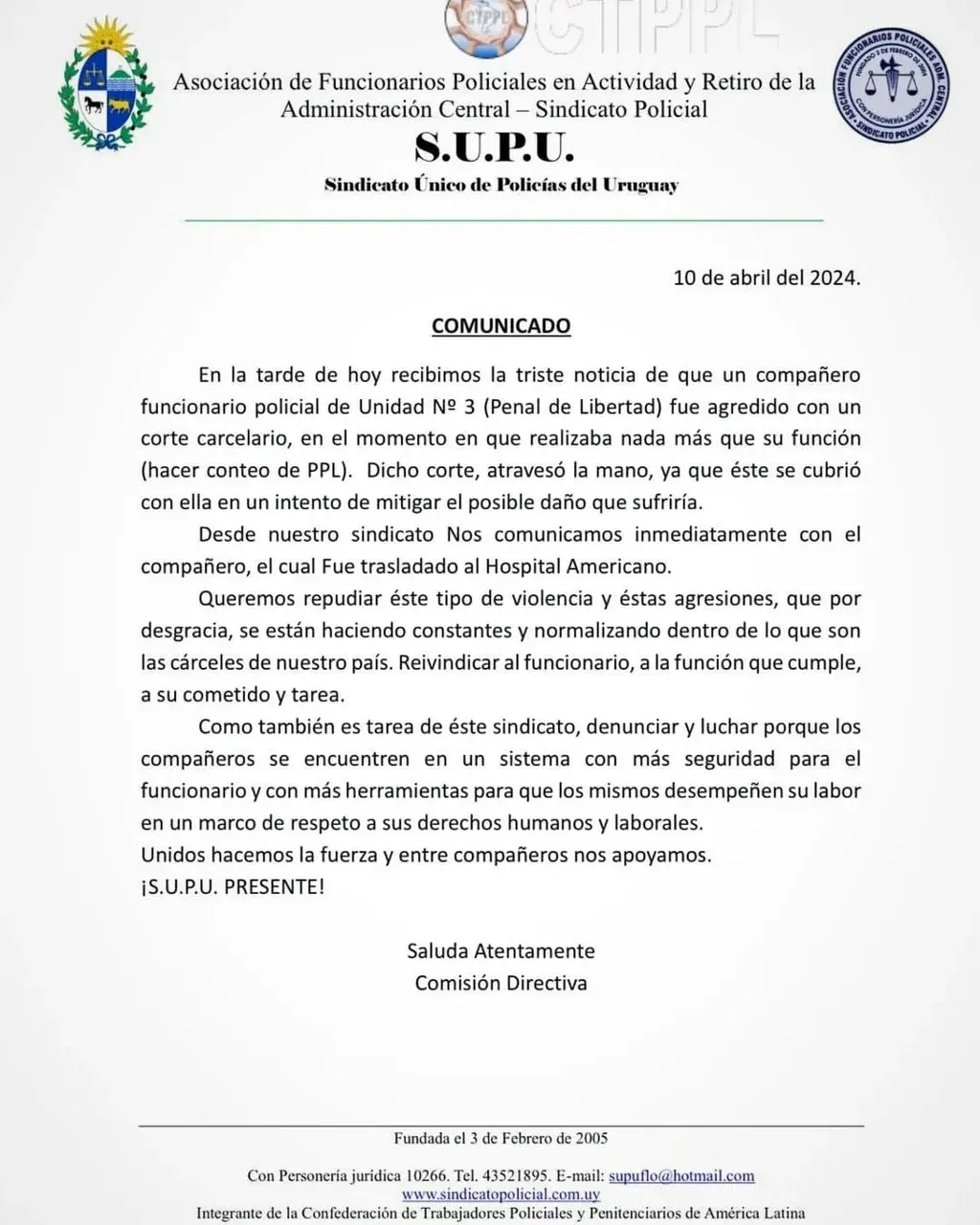 En la tarde de ayer, el Sindicato Único de Policías del Uruguay (SUPU) divulgó un comunicado donde denunció que un funcionario policial fue agredido por un recluso con un "corte carcelario" que le "atravesó la mano" cuando se cubrió para defenderse.