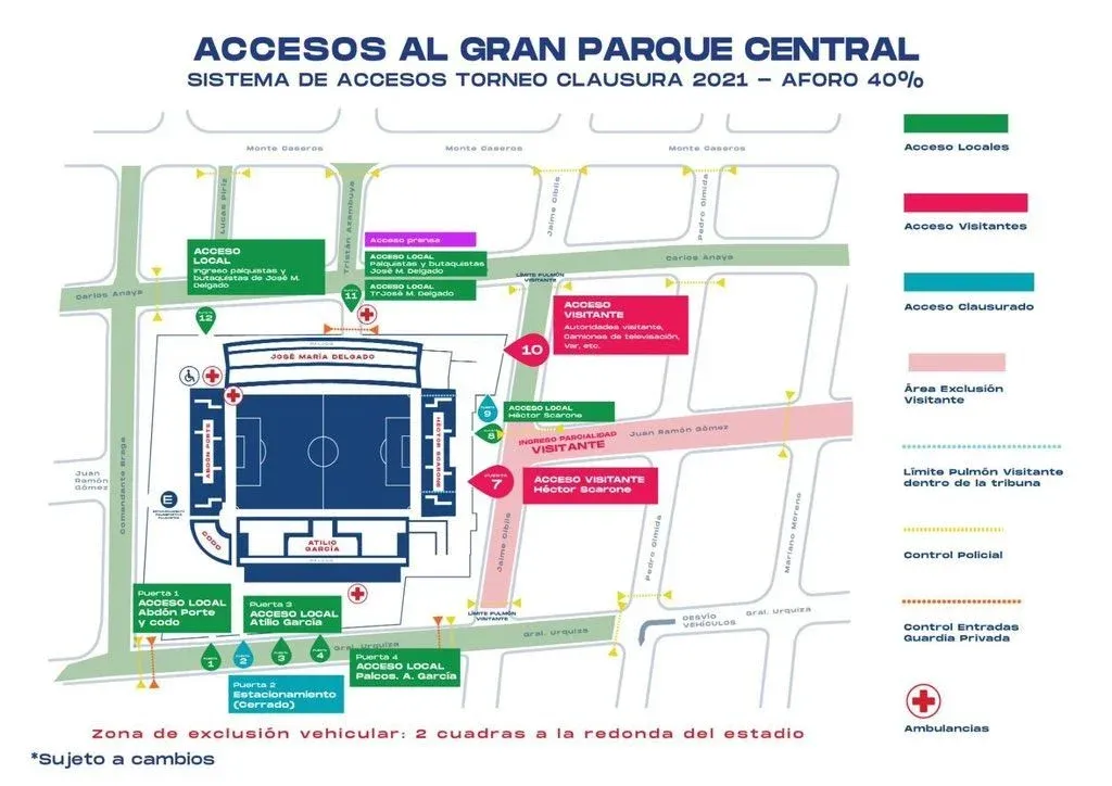 Cada socio deberá llegar al Gran Parque Central con tiempo suficiente para pasar cada control establecido en los distintos puntos marcados en el siguiente mapa, según la tribuna a la que se dirijan.