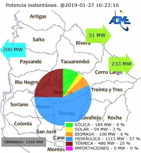 Uruguay también está exportando excedentes de energía a Brasil y a Argentina por estas horas, según informa la Administración del Mercado Eléctrico (Adme). En lo que va del mes se vendieron 372.000 MWh a la vecina orilla y 47.800 MWh al país norteño.