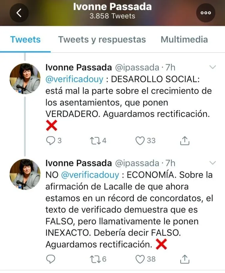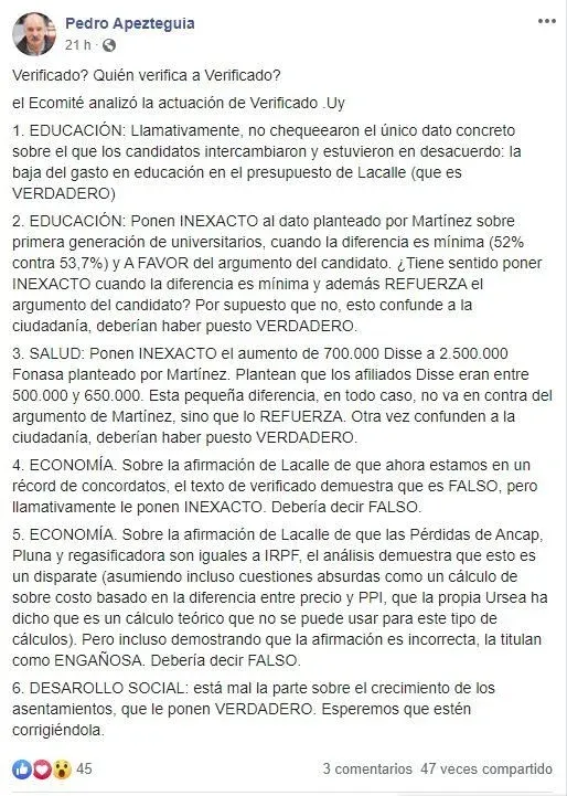 La senadora Ivonne Pasada también emitió un mensaje de estructura similar a otro de Asti antes del debate. En tanto, en la tarde del jueves publicó señalamientos contra verificado que habían circulado por Whatsapp. Este contenido también fue difundido en Facebook por el director de descentralización de la Oficina de Planeamiento y Presupuesto (OPP), Pedro Apezteguía.