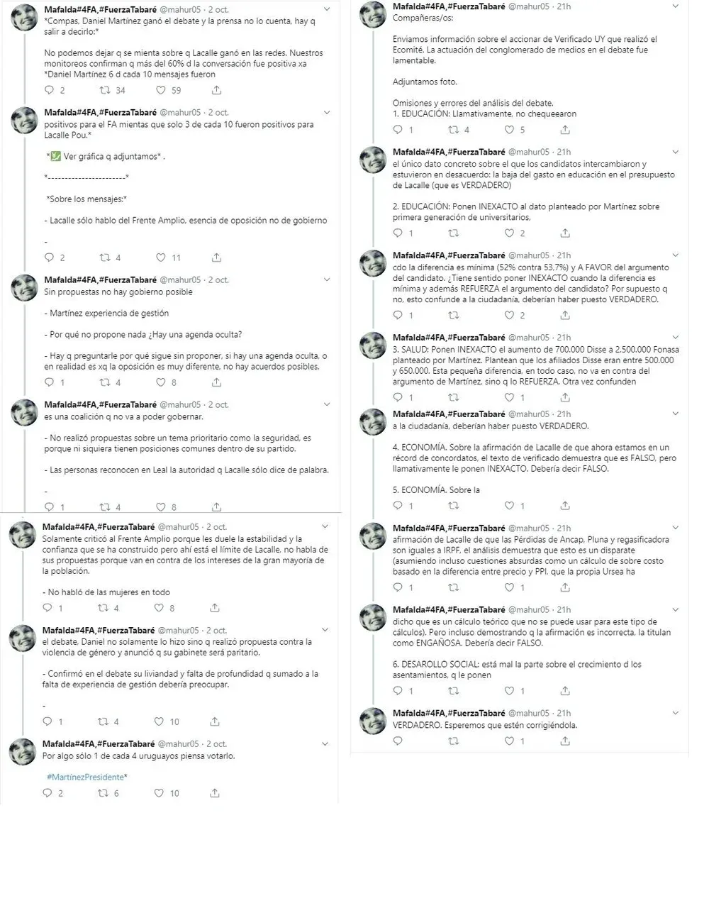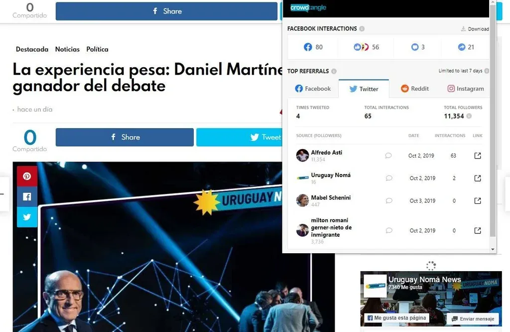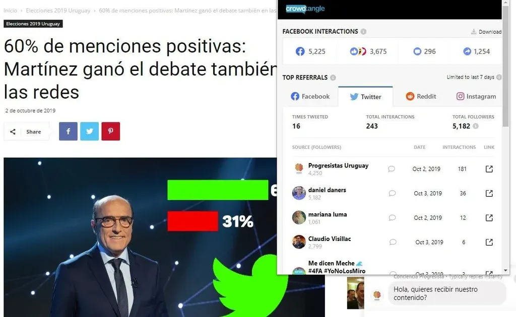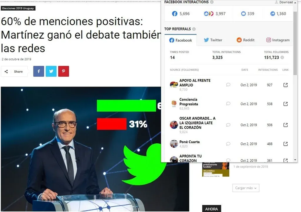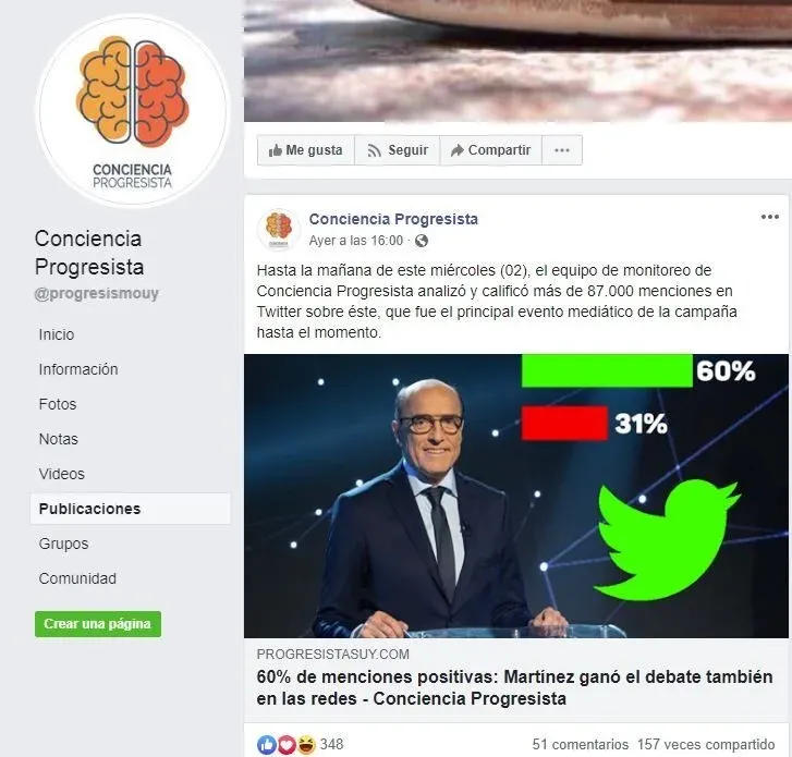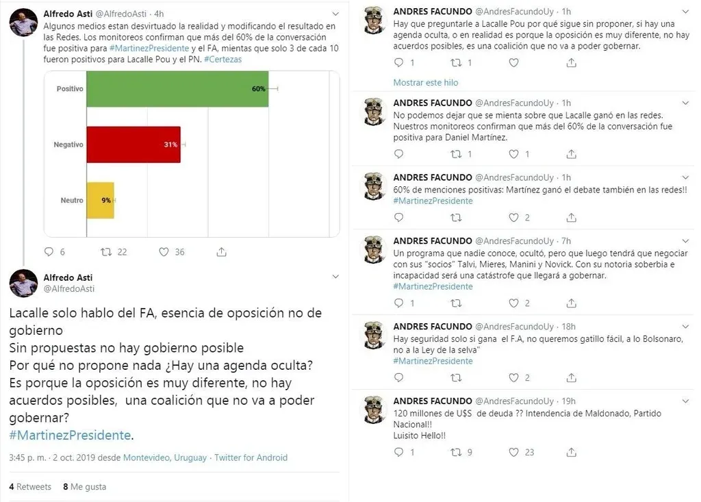 Al ingresar al enlace de progresistasuy.com se podía leer: “Martínez registró un gran porcentaje de comentarios positivos (60%) con su nombre o con el hashtag #MartinezPresidente. Predominaron los argumentos en defensa del candidato y los logros de los gobiernos del Frente Amplio, así como los memes que se burlaron del desempeño de Lacalle Pou en el debate”. El artículo también señaló que “hasta la mañana de este miércoles (2 de octubre), el equipo de monitoreo de Conciencia Progresista analizó y calificó más de 87.000 menciones en Twitter sobre éste, que fue el principal evento mediático de la campaña hasta el momento”.