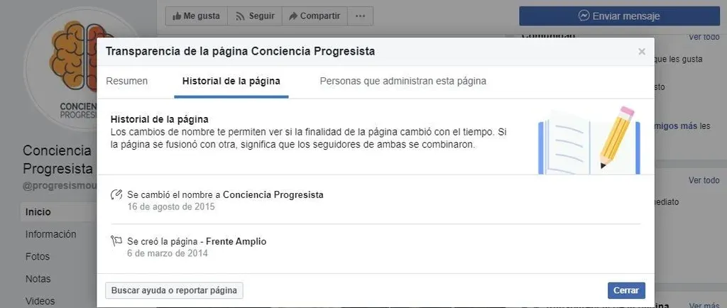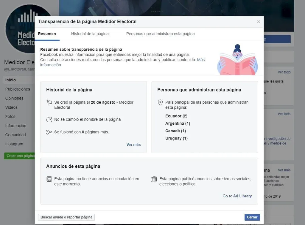 La pagina de Facebook de Medidor Electoral fue creada el 20 de agosto y las personas que la administran residen en Uruguay (1), Argentina (1), Canadá (1), Ecuador (2).