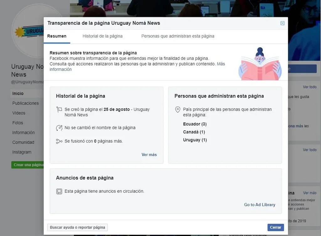 La página de Facebook de Uruguay Noma News fue creada el 25 de agosto de 2019 y tiene un administrador en Uruguay, uno en Canadá y tres en Ecuador.