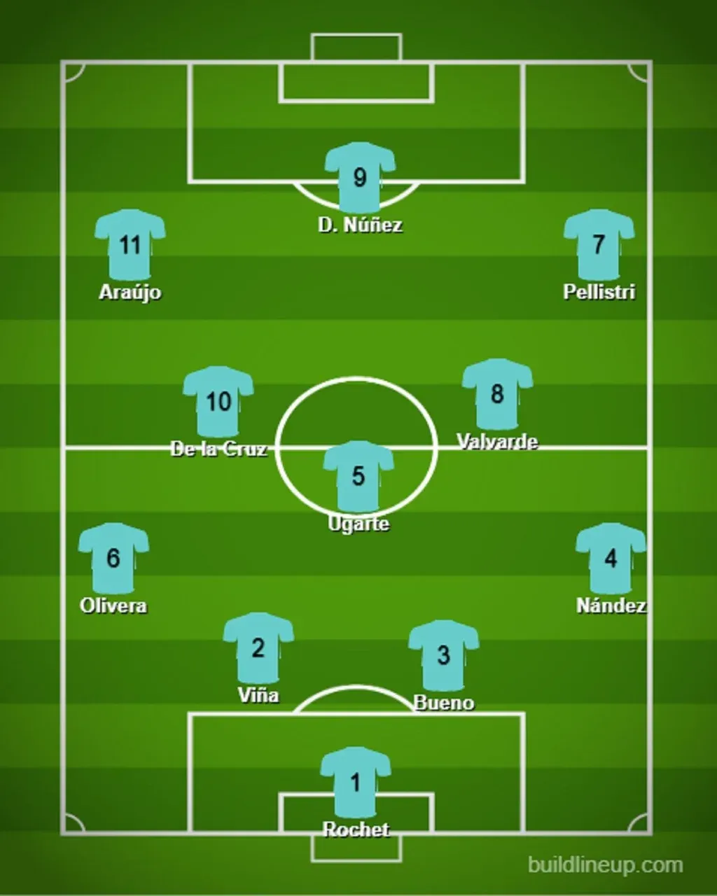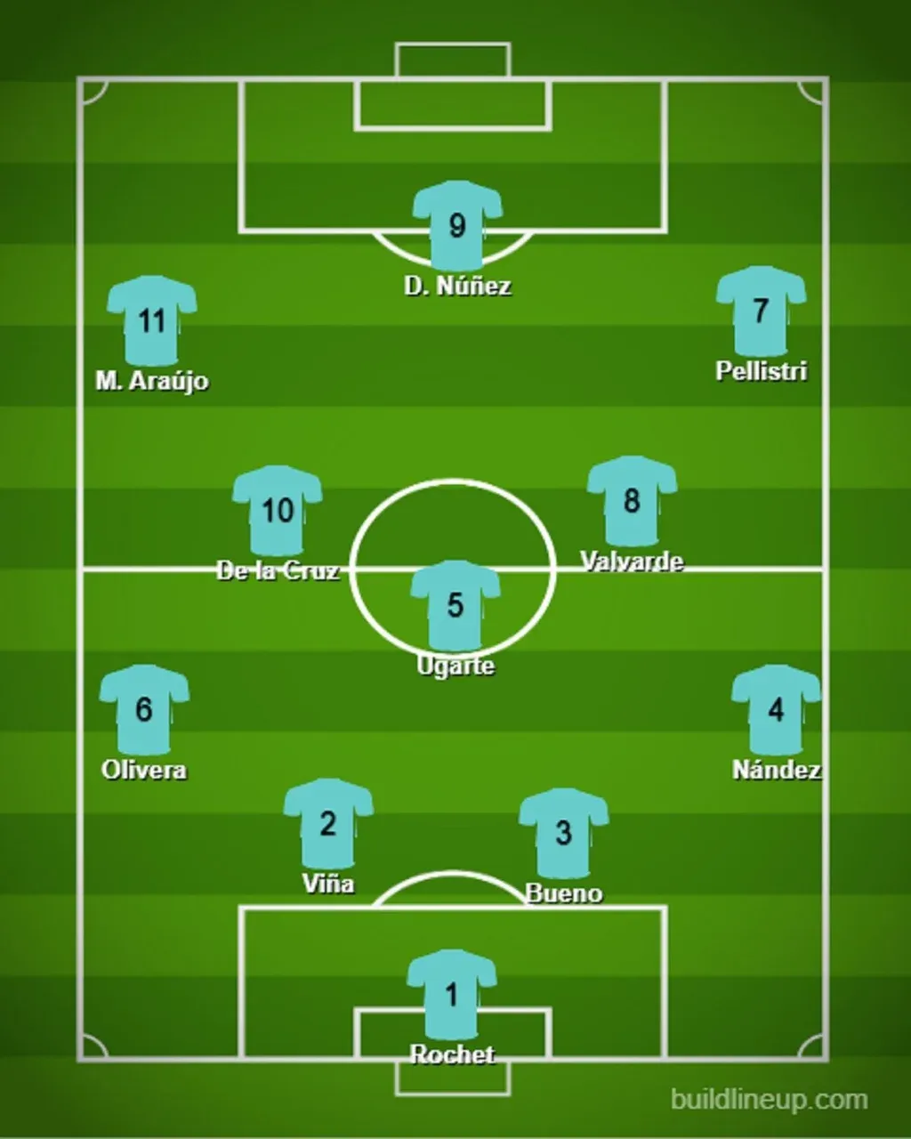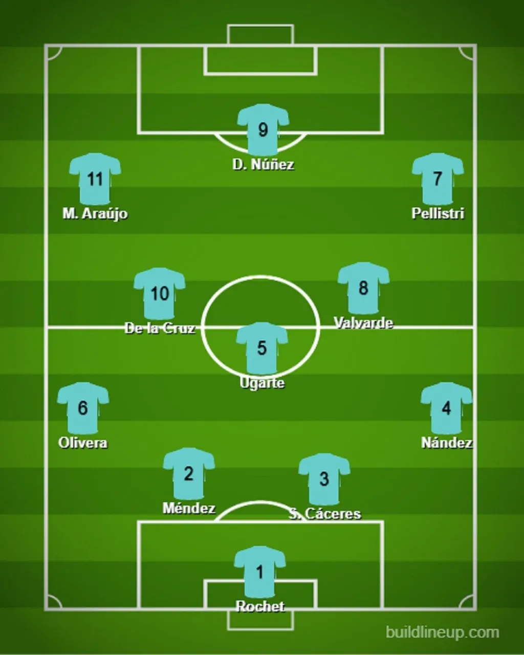 En la defensa el lateral derecho y el izquierdo se repite en las cinco formaciones con Nahitan Nández de un lado y Mathías Olivera por izquierda.