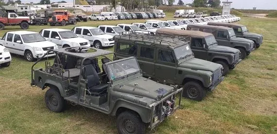 Entre los vehículos hay camionetas Land Rover, autos, camionetas doble cabina, minibuses y camiones.