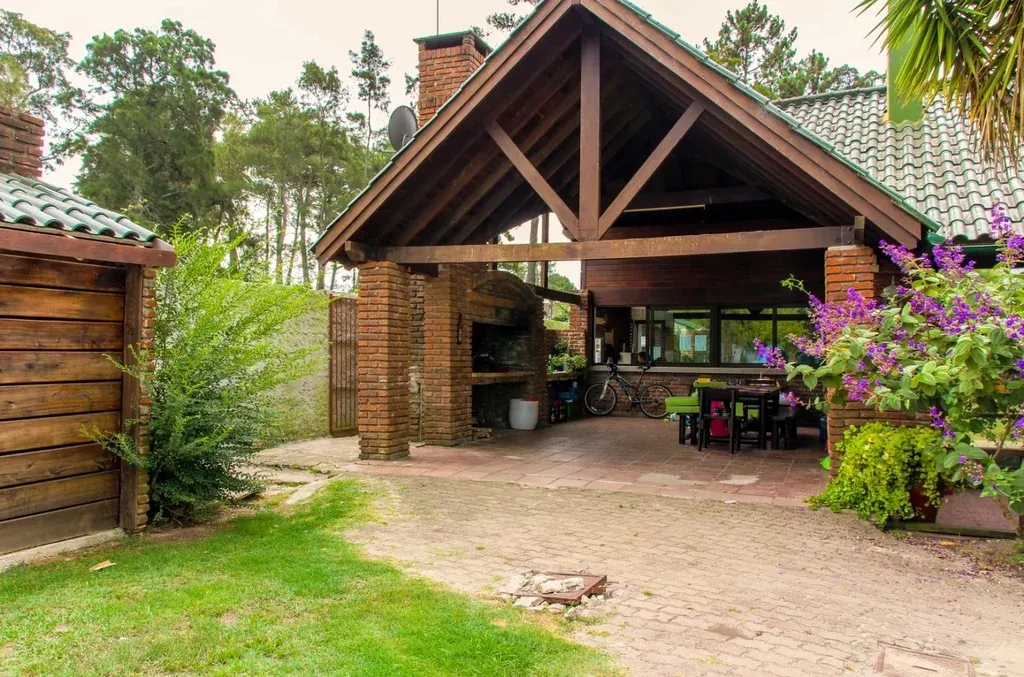 La casa es de construcción de ladrillo visto, tres dormitorios, amplio escritorio con baño y vista exterior, living comedor con estufa a leña, baño social, suite, cocina amplia desarrollada en un ambiente con parrillero interno, porche también con parrillero y buhardilla. En el fondo del terreno hay una construcción con baño.