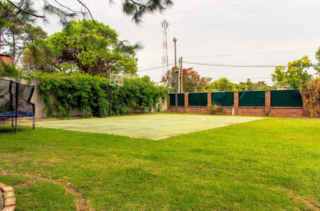 La propiedad cuenta con un perímetro delimitado y cerrado con un muro de dos metros de altura, gran portón corredizo para vehículos y excelente ingreso a la propiedad con camino adoquinado por el que se accede a un jardín arbolado. A la derecha hay una piscina de 60 metros cuadrados -de 12 metros por 5 metros aproximadamente-, una cancha de básquetbol y un gran jardín. Al fondo hay una cochera abierta para varios vehículos.