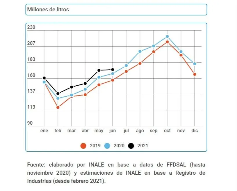 La remisión acumulada en 2021, ahora en el segmento enero-junio, se situó en 940,4 millones de litros, un registro 5,5% por encima de lo remitido en el semestre inicial de 2020.