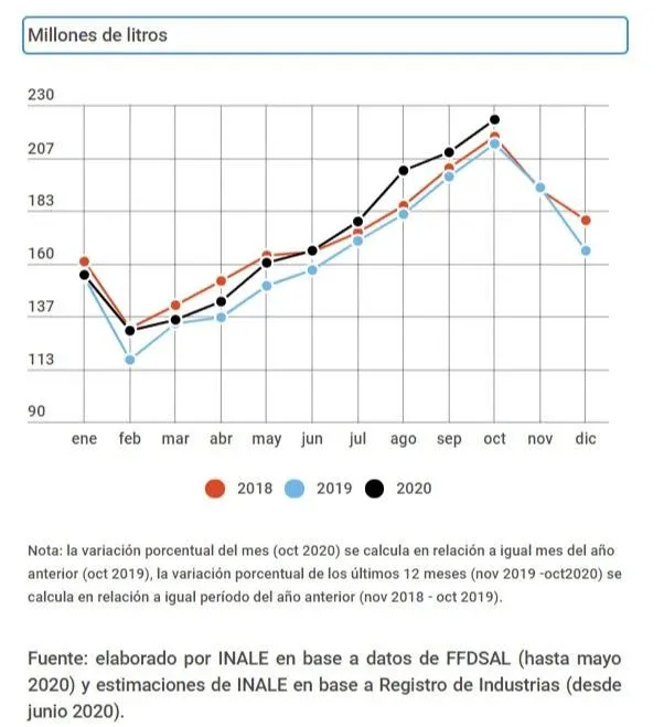 Comparando la remisión mensual, en octubre de 2020 se enviaron 223 millones de litros, un 4,8% más que lo logrado en ese mismo mes del año pasado (213 millones de litros).