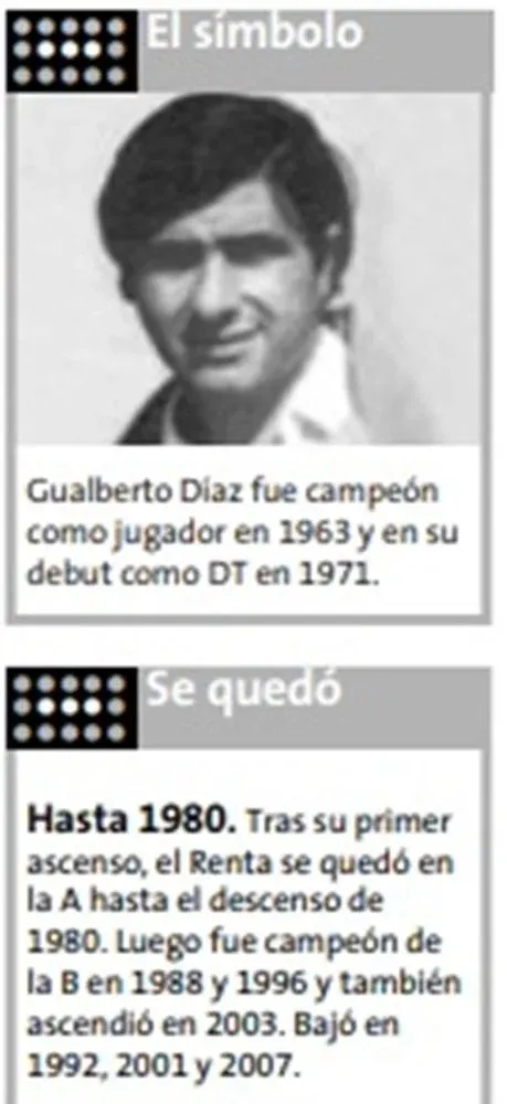 Es que, fundado en 1933, Rentistas fue campeón de la Extra en 1963 y de la Intermedia en 1966. Cinco años más tarde y bajo la égida de Gualberto Díaz –un símbolo del club que se estrenaba ese año como técnico– logró un salto histórico al llegar al círculo de privilegio.