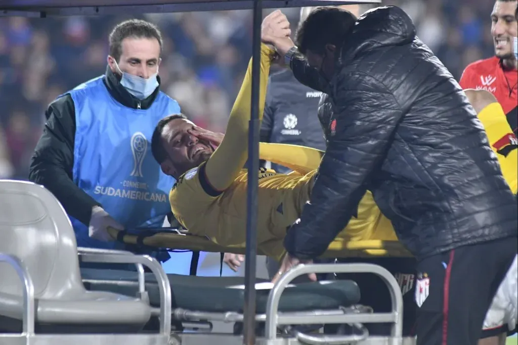El golero quedó tendido en el piso tras evitar la caída de su arco y el partido estuvo detenido durante cinco minutos. En su lugar Renan Santos a los 21.