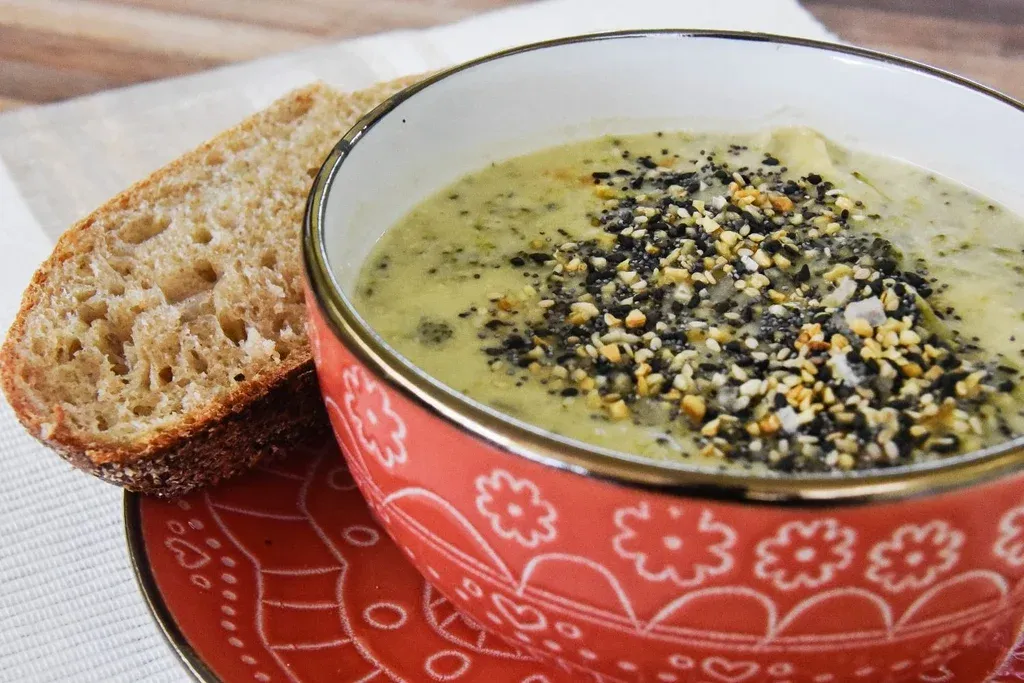 Preparar previamente una mezcla de semillas de lino y amapola con escamas de ajo y sal con especias. Poner sobre la sopa al momento de servir y acompañar con pan de masa madre.