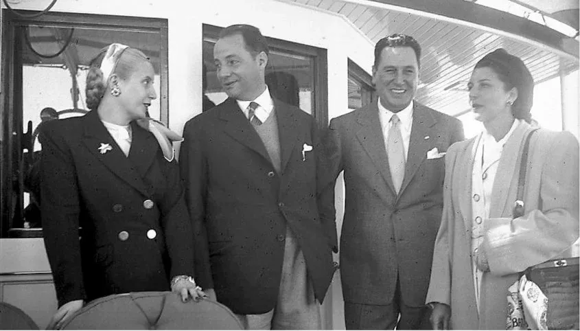 Eva Duarte, Luis Batlle, Juan Domingo Perón y Matilde Ibáñez el 27 de febrero de 1948, en el Río de la Plata, frente a Carmelo. Las relaciones bilaterales se deteriorarían muy rápidamente.