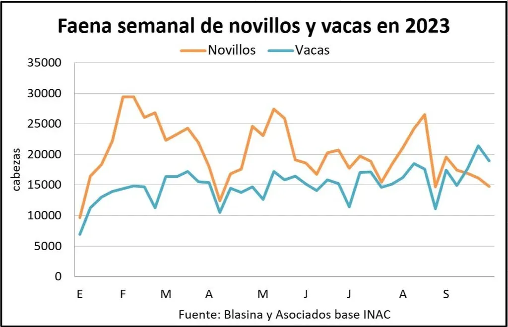 En Uruguay, la retracción de la oferta se reflejó en el dato de faena que la semana pasada cayó 9% y quedó en 39.733 vacunos. Después de dos meses de subas interanuales, setiembre cerró con una caída de 3,8% frente al mismo mes de 2022, con 174.012 cabezas industrializadas. El destaque nuevamente fueron las vacas, que superaron en número a los novillos.
