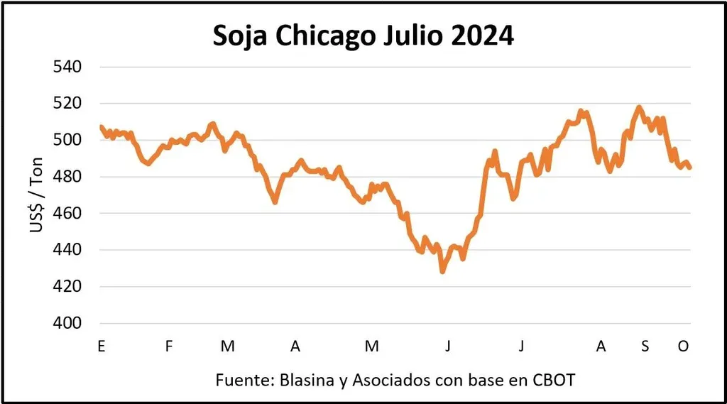 El mercado de soja no logró consolidar la suba y cerró su sexta semana a la baja, lejos de los US$ 500 por tonelada. La soja de la cosecha 2024 mantuvo los US$ 485 del viernes pasado y la posición noviembre cerró a US$ 465, tres dólares por debajo del viernes pasado. La semana estuvo marcada por ligeras fluctuaciones, y precios presionados por el avance de 36% de la cosecha de Estados Unidos y el fortalecimiento de la competitividad de Brasil por la suba del dólar de 2,3% esta semana.