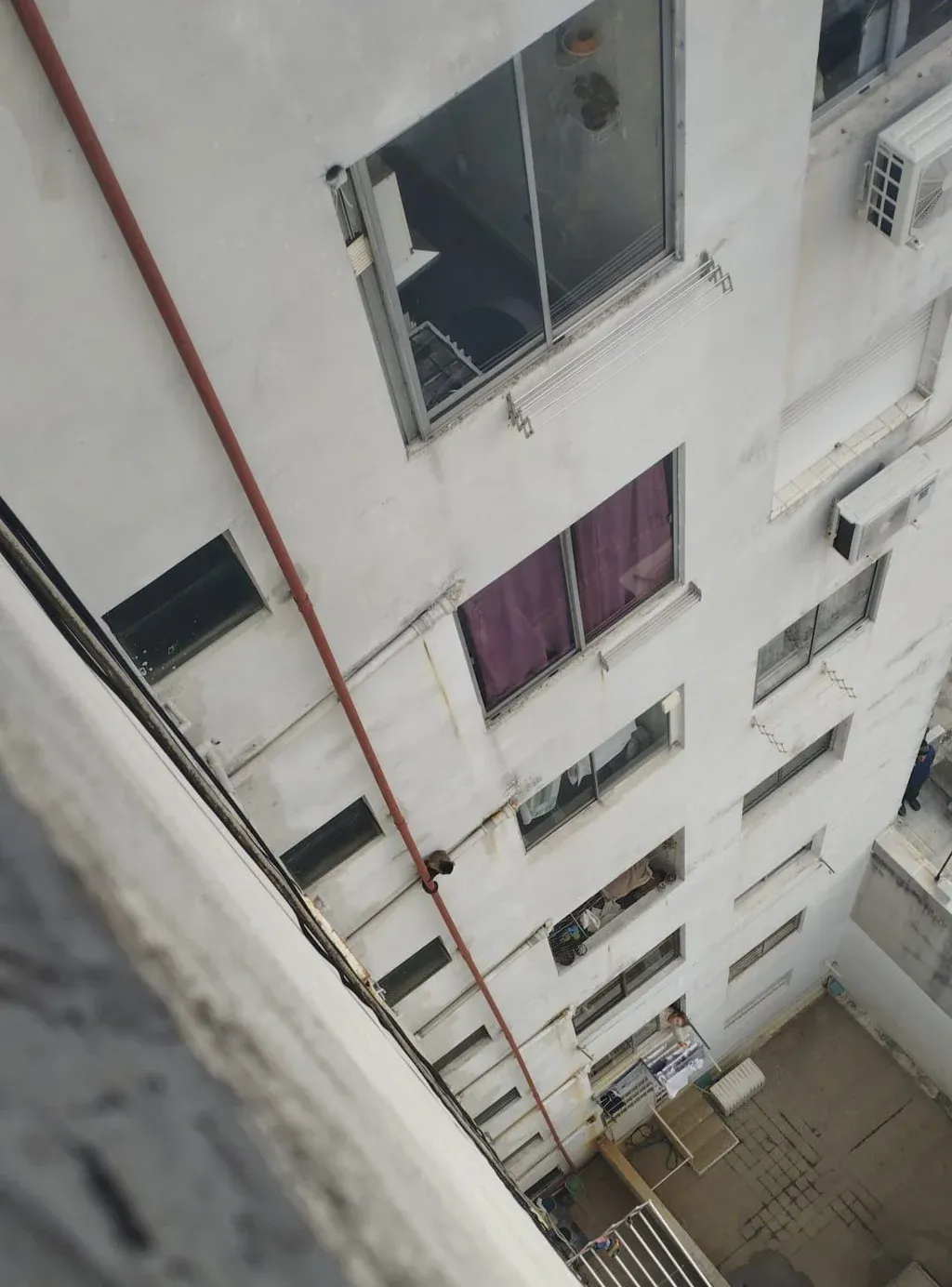 El caño de agua externo por el que el mono pasó del techo, al garaje del edificio El Cid