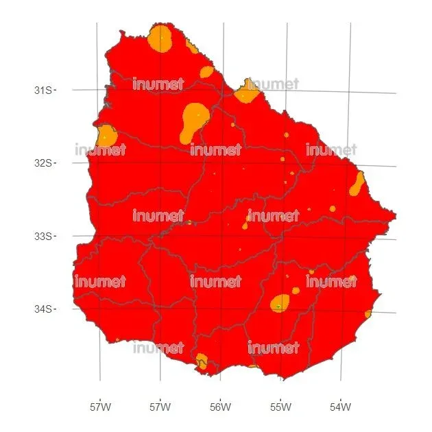 Por otro lado, Artigas, Rivera, Paso de los Toros, Juan Lacaze, el balneario Solís y la zona del Aeropuerto de Melilla se encuentran bajo un nivel de riesgo de incendio alto, identificado con color naranja.