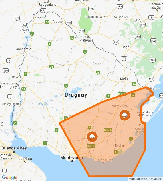El Inumet había emitido una alerta naranja y otra amarilla para el sur del país que rigió hasta las 20. 30 horas. La alerta naranja era para toda la zona costera y la franja sur, mientras que la advertencia de color amarillo atraviesa el territorio de Soriano a Rocha.
