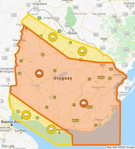 El Instituto Uruguayo de Meteorología (Inumet) había emitido una doble alerta naranja y amarilla por persistencia de tormentas y lluvias para casi todo el país.