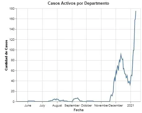 El departamento pasó de registrar 33 casos activos el último día del 2020 a 175 para la noche del martes, según actualizó el Sistema Nacional de Emergencias (Sinae). Como puede observarse en la gráfica elaborada por el Grupo Uruguayo Interdisciplinario de Análisis de Datos (Guiad), la cantidad de enfermos en Rocha desde el 31 de diciembre presenta una pendiente ascendente, al quintuplicar el total en solo 12 días.