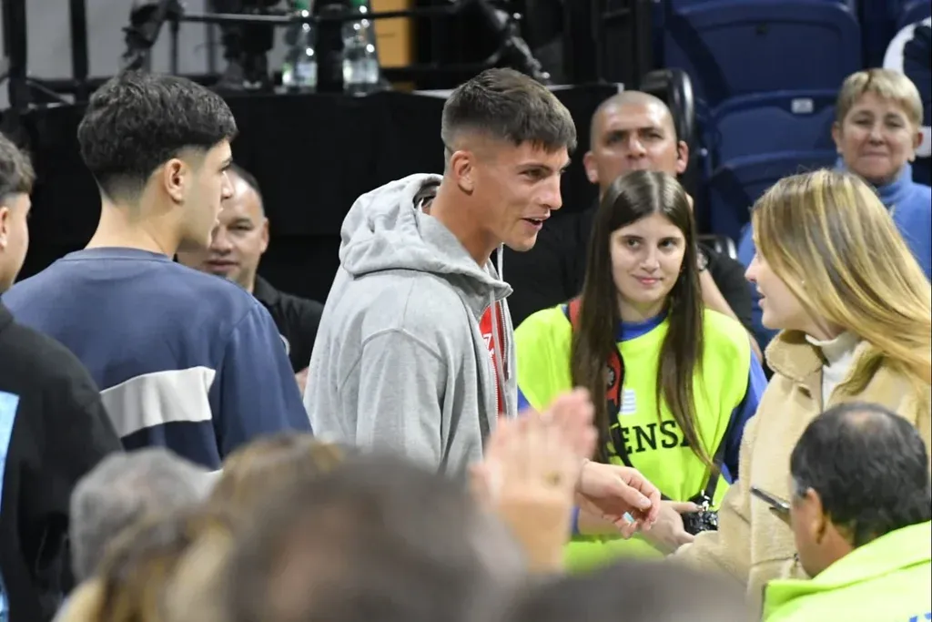 Tres jugadores del plantel de fútbol de Nacional, el capitán Sergio Rochet, el volante Diego Zabala y el juvenil Renzo Sánchez, fueron al Antel Arena a alentar al bolso en la cuarta final de la Liga contra Hebraica Macabi