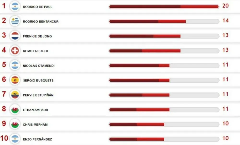 Posteriormente hubo cuatro jugadores que empataron con 11: Nicolás Otamendi de Argentina, Sergio Busquets de España, Pervis Estupiñán de Ecuador y Ethan Ampadu de Gales.
