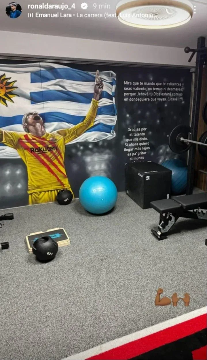 Ronald Araujo, el zaguero de la selección uruguaya y de FC Barcelona, mostró en sus redes su espectacular gimnasio personal, en el que tiene dibujos y frases motivadoras en sus paredes.