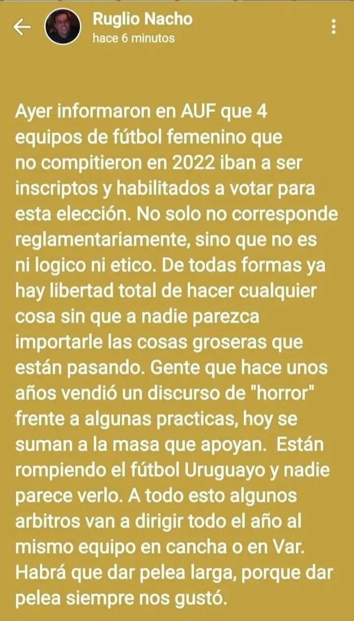 “Ayer informaron en AUF que 4 equipos de fútbol femenino que no compitieron en 2022 iban a ser inscriptos y habilitados a votar para esta elección”, escribió el titular carbonero en su estado de Whatsapp. “No solo no corresponde reglamentariamente, sino que no es ni lógico ni ético”, agregó.