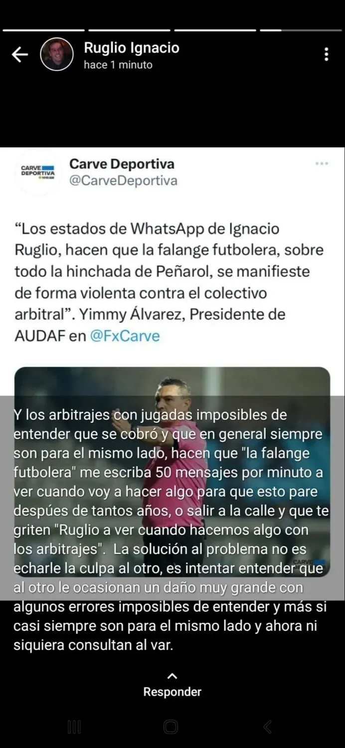 Ruglio publicó en un estado de WhatsApp una captura de pantalla de un tuit de Cave Deportiva con una frase de una nota radial que dio Álvarez. La misma decía: "Los estados de WhatsApp de Ignacio Ruglio, hacen que la falange futbolera, sobre todo la hinchada de Peñarol, se manifieste de forma violenta contra el colectivo arbitral".