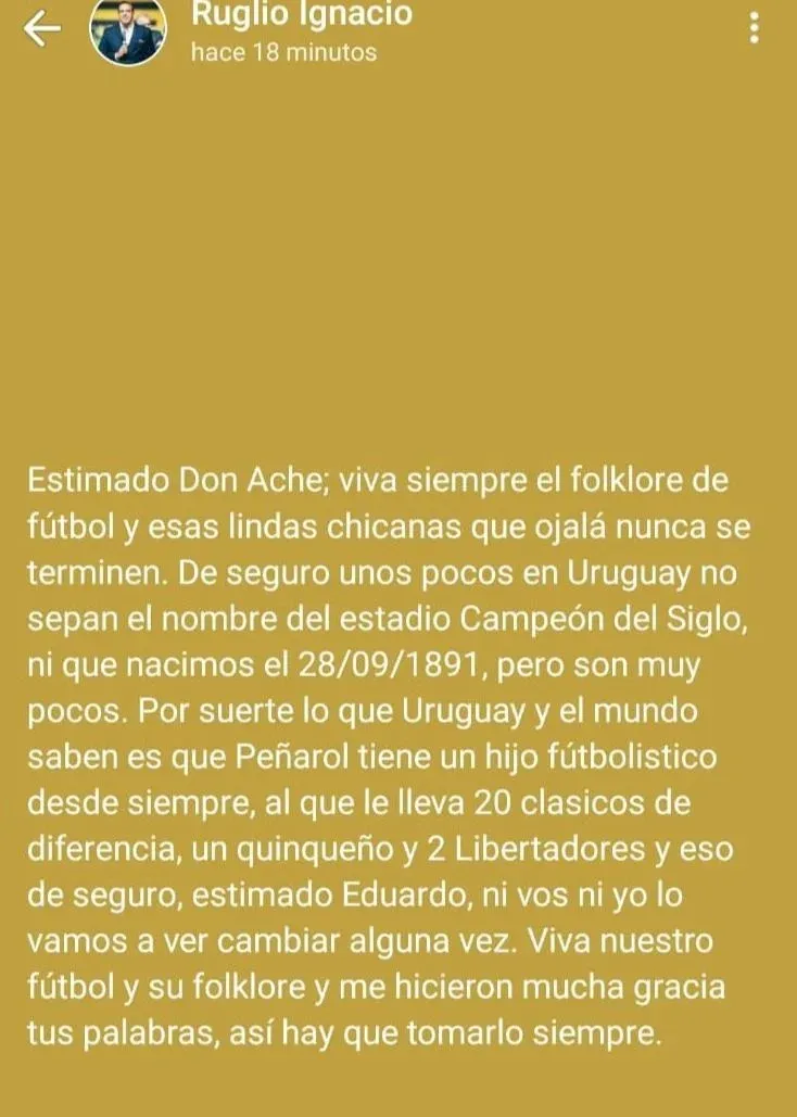"Estimado Don Ache: viva siempre el folklore de fútbol y esas lindas chicanas que ojalá nunca se terminen. De seguro unos pocos en Uruguay no sepan el nombre del Estadio Campeón del Siglo, ni que nacimos el 28/09/1891, pero son muy pocos. Por suerte lo que Uruguay y el mundo saben es que Peñarol tiene un hijo futbolístico desde siempre, al que le lleva 20 clásicos de diferencia, un quinquenio y 2 Libertadores y eso de seguro, estimado Eduardo, ni vos ni yo lo vamos a ver cambiar alguna vez. Viva nuestro fútbol y su folklore y me hicieron mucha gracias tus palabras, así hay que tomarlo siempre".