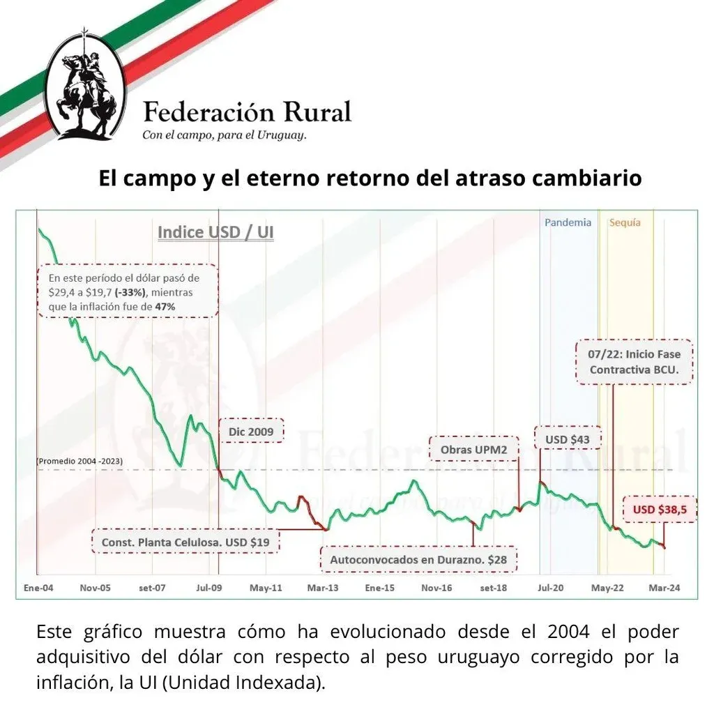 Fuente: Federación Rural En el comunicado en X se recordó, a la vez, el puerto de Montevideo, principal vía de salida de la producción agroindustrial local, en agostó aumentó 13% sus tarifas en dólares para las exportaciones, lo que es absorbido por la cadena productiva.