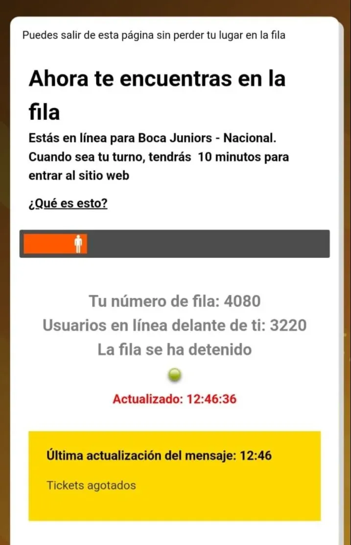 Venta de entradas para Boca vs Nacional Luego, sobre la hora 12:45, según constató Referí, apareció el anuncio de “tickets agotados”, cuando aún había más de 4.000 hinchas conectados a la espera de poder comprar su entrada virtual.