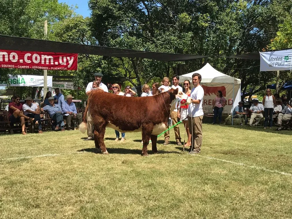 Gonzalo Rodríguez Mendaro, jurado de la raza Hereford en la 107ª Expo Durazno, coronó como Gran Campeón Polled Hereford –y campeón supremo de la raza– a un ejemplar expuesto por cabaña San Gregorio Ganadera LTDA, de la familia Fernández.