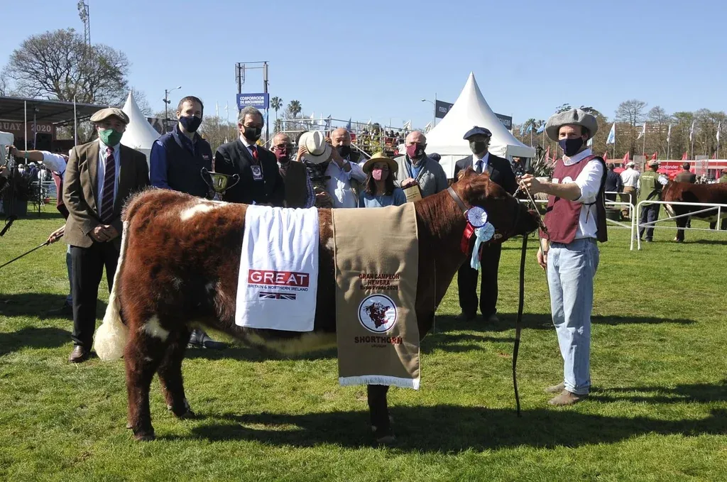Premiaron al Gran Campeón Jorge Bonino, por la Asociación Rural del Uruguay (ARU); Faye 0’Connor, embajadora del Reino Unido en Uruguay; y Juan Carlos Moreno, por la gremial de criadores. Y a la Gran Campeona Rodolfo Lugaro, presidente de la Sociedad de Criadores de Shorthorn del Uruguay; Fernando Mattos, presidente del Instituto Nacional de Carne; Rafael Ferber, director de exposiciones de la ARU; Rosa Comane, por la embajada del Reino Unido; y Juan Francisco Nascimento, por la raza Shorthorn.
