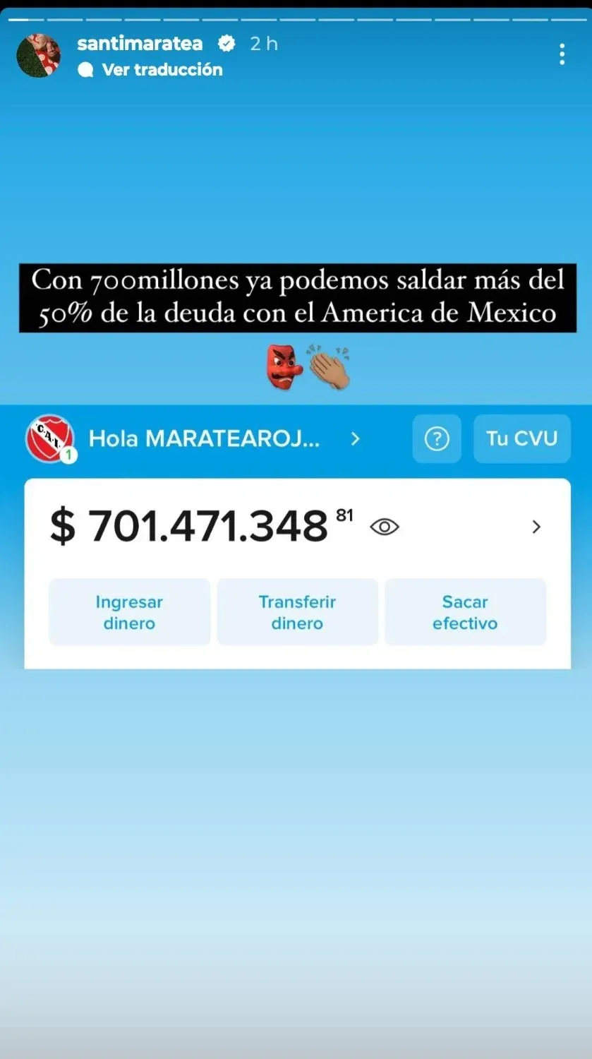 Santi Maratea, el influencer argentino que lleva adelante una colecta para ayudar al club Independiente de Avellaneda a pagar sus deudas, anunció en sus redes que ya alcanzó montos suficientes para pagar más de la mitad de la principal deuda que tiene el “Rojo” con otros equipos y futbolistas.