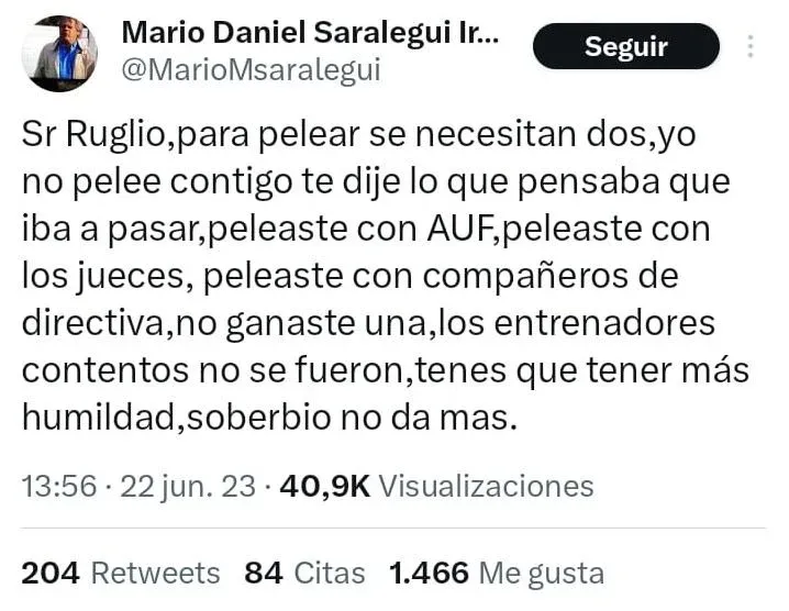 Mario Daniel Saralegui criticó al presidente de Peñarol, Ignacio Ruglio, a través de su cuenta de Twitter, luego de que el nombre del entrenador fuera presentado como una opción para tomar el primer equipo, lo que no fue considerado por el titular del club.