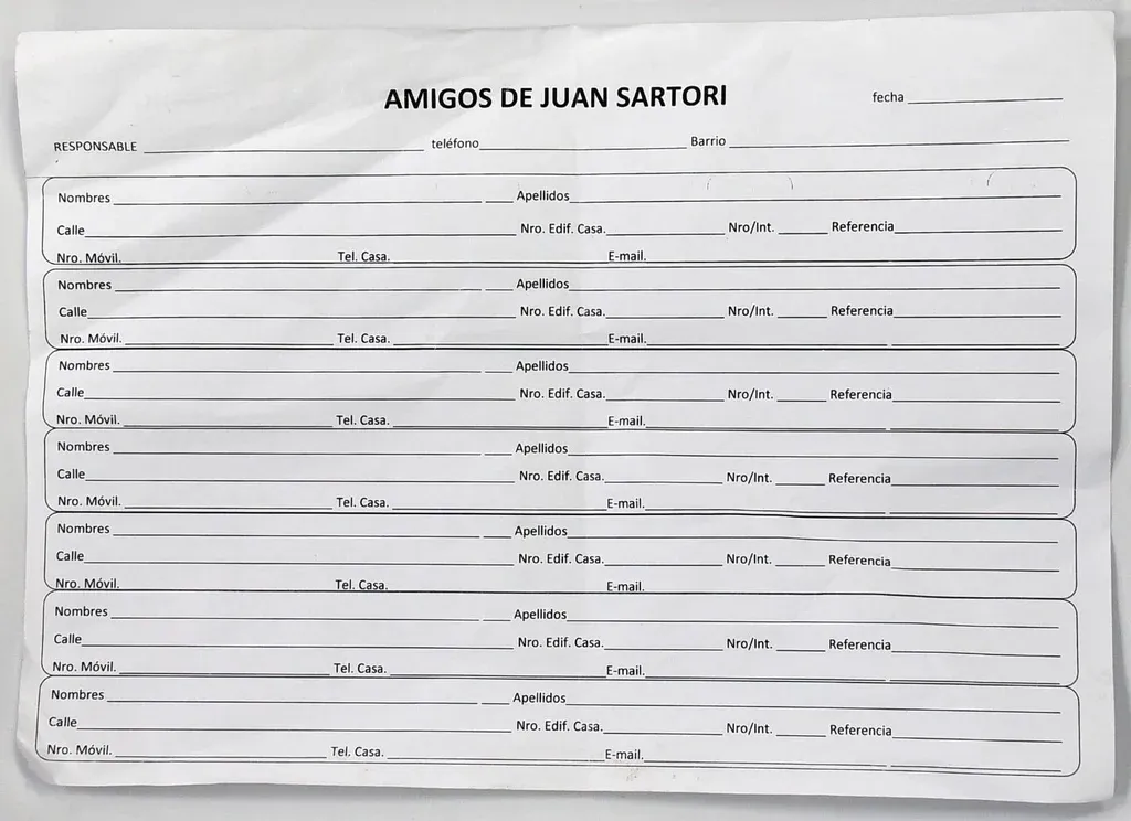 Cada vez que se visita una de estas viviendas, los trabajadores deben pintar el padrón que le corresponde y llenar unos formularios titulados “Amigos de Juan Sartori”, en los que se piden datos como nombre, calle, celular y mail de las personas que habitan allí. Asimismo, en caso de que alguna persona manifieste que pretende votar a Sartori se le pide además que diga cuál es su número de credencial cívica, de modo de verificar dónde les tocará votar y así llevarlos en caso de que lo necesiten.