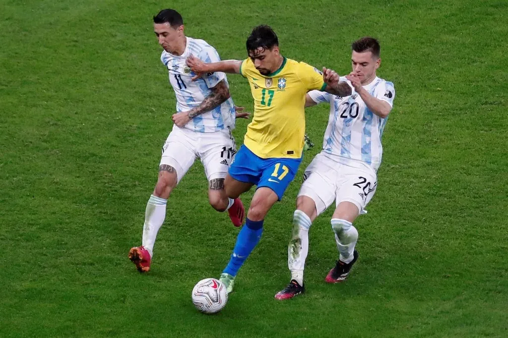 Amarillas: Fred, Renan Lodi, Paquetá, Marquinhos (B), Paredes, Lo Celso, De Paul, Otamendi, Montiel (A)