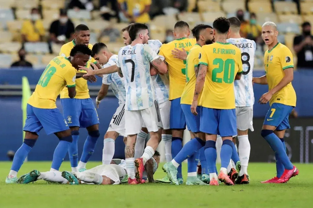En cinco minutos de juego aún no habían llegado a las áreas con peligro. Solo intentos por parte de los dos equipos, pero al mismo tiempo trataban de no dejar espacios y de controlar muy bien a las figuras de ambas selecciones: Neymar por parte de Brasil, bien controlado por el doble 5 Paredes de De Paul, y Messi en Argentina, a quien siguen de cerca Casemiro y Fred.