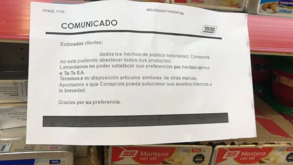 El problema también afecta a las grandes superficies. En uno de los supermercados de Ta-Ta se exhibió en estos días un cartel donde se explica al cliente lo que está sucediendo.