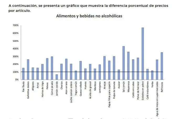 Para el caso de comidas fuera del hogar, los refrescos y el agua mineral tienen diferencias de precios de 157% y 86%, mientras que para la hamburguesa completa y la pizza con muzarela las diferencias resultan en 253% y 146%.