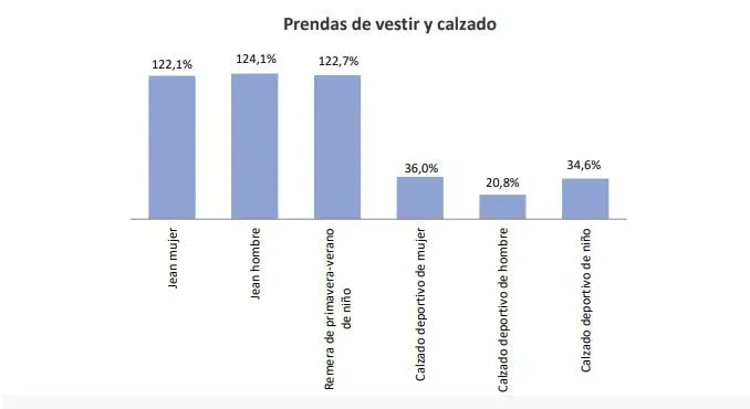 El rubro vestimenta presenta mayor diferencia de precios y se ubica entre 122% y 124%. En lo que refiere al calzado deportivo, las diferencias de precios son menores y se encuentran entre 21% y 36%.