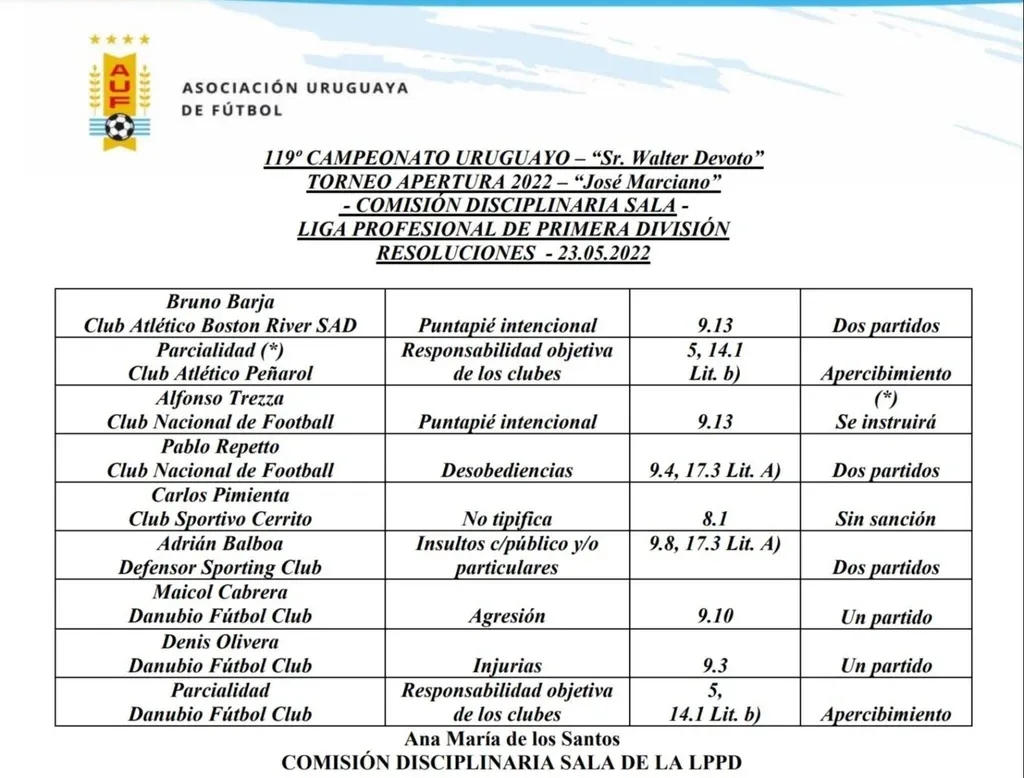 En la misma, se señala que el técnico de Nacional, Pablo Repetto, expulsado en el partido ante Albion, recibió una sanción de dos partidos por concepto de “desobediencias”. El entrenador fue expulsado luego de interponerse ante dos jugadores rivales cuando iban a sacar un lateral e inmediatamente reconoció su error y pidió disculpas.