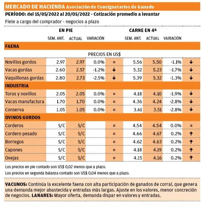 Los negocios por novillos gordos buenos van entre US$ 5,25 y US$ 5,30 por kilo en cuarta balanza, y algunos centavos más para ganados especiales. Se han concretado negocios puntuales arriba de US$ 5,40. La vaca gorda está en torno a US$ 5,10 y la vaquillona sobre los US$ 5,25 por kilo.