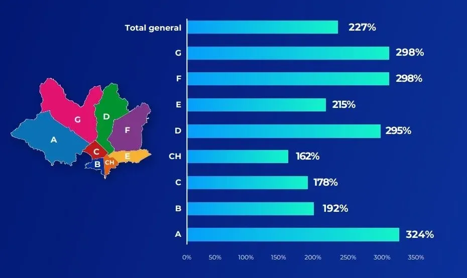 Si se analiza por zona geográfica de Montevideo, “se observa un mayor crecimiento en la zona norte y oeste de la capital”, detalla el análisis. Si se compara por volumen de ventas de agua embotellada entre mayo de 2023 con el de 2022, los barrios que más consumieron fueron los que se encuentran en el municipio A (aumento de 324%). El que menos lo hizo fue el CH, cuyo crecimiento en términos de volumen fue de 162%.
