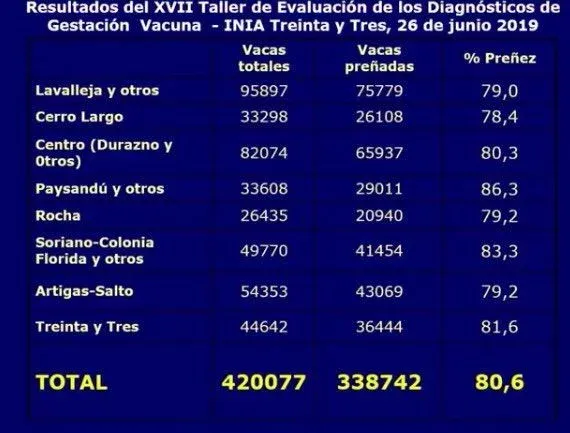 Paysandú –y otros– fue el departamento en donde se registró el mayor porcentaje de preñez: 86,3%. Le sigue Soriano, Colonia, Florida –y otros– que obtuvieron un 83,3%. Treinta y Tres arrojó una media de 81,6%. Artigas, Salto y Rocha obtuvieron un 79,2%, Lavalleja un 79% y Cerro Largo fue donde se registró el porcentaje más bajo, de 78,4%.