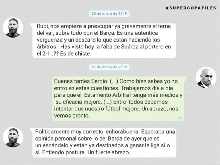 El diario español El Confidencial, destapó este viernes un chat privado de enero de 2019 entre el zaguero y capitán entonces de Real Madrid y de la selección española, Sergio Ramos, en el que le protesta al presidente de la Real Federación Española de Fútbol (RFEF), Luis Rubiales, que "el VAR es una vergüenza", porque Luis Suárez, en aquel momento, defendiendo a Barcelona, había cometido una falta al arquero rival.