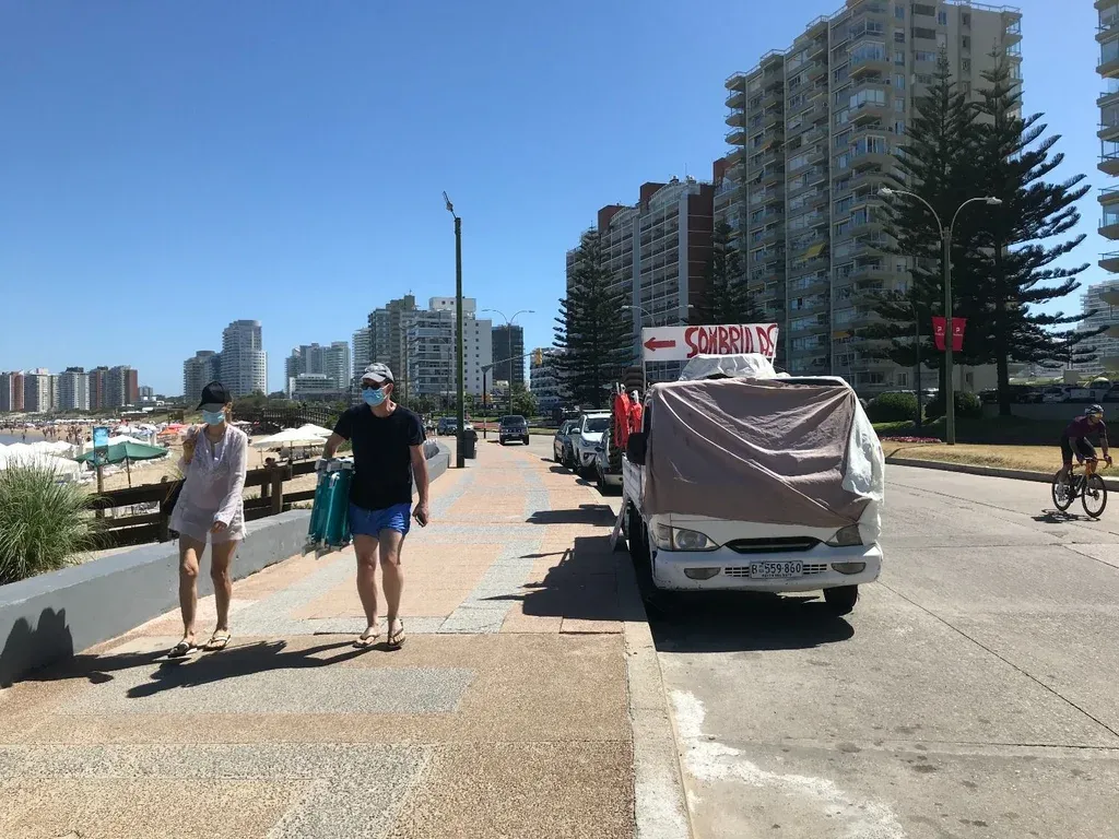 Es el horario más vacío del día. Una brisa alivia el insoportable calor y algunos veraneantes empiezan a bajar a la playa. Un señor de tapabocas llega con su silla en mano y antes de continuar, frena y mira. Hace un paneo con su cabeza buscando un lugar, y continúa hacia la orilla. Unos minutos más tarde encuentra un lugar para armar su campamento: casi arriba del agua.
