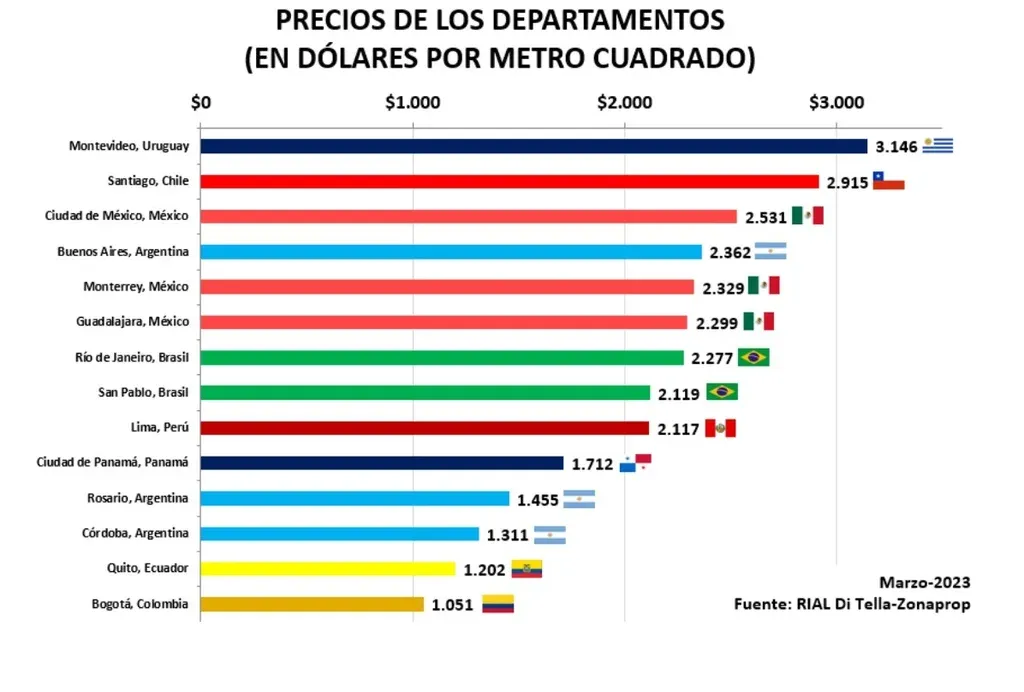 Montevideo volvió a posicionarse como la ciudad con los apartamentos más caros de América Latina en términos de valor por metro cuadrado, según el último reporte regional presentado este martes por la universidad argentina Torcuato Di Tella.